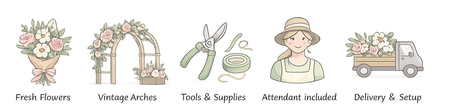 Includes flowers, vintage arches, setup, professional guidance, and delivery — everything handled for you!